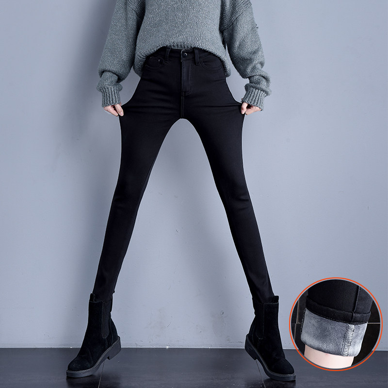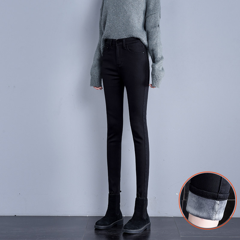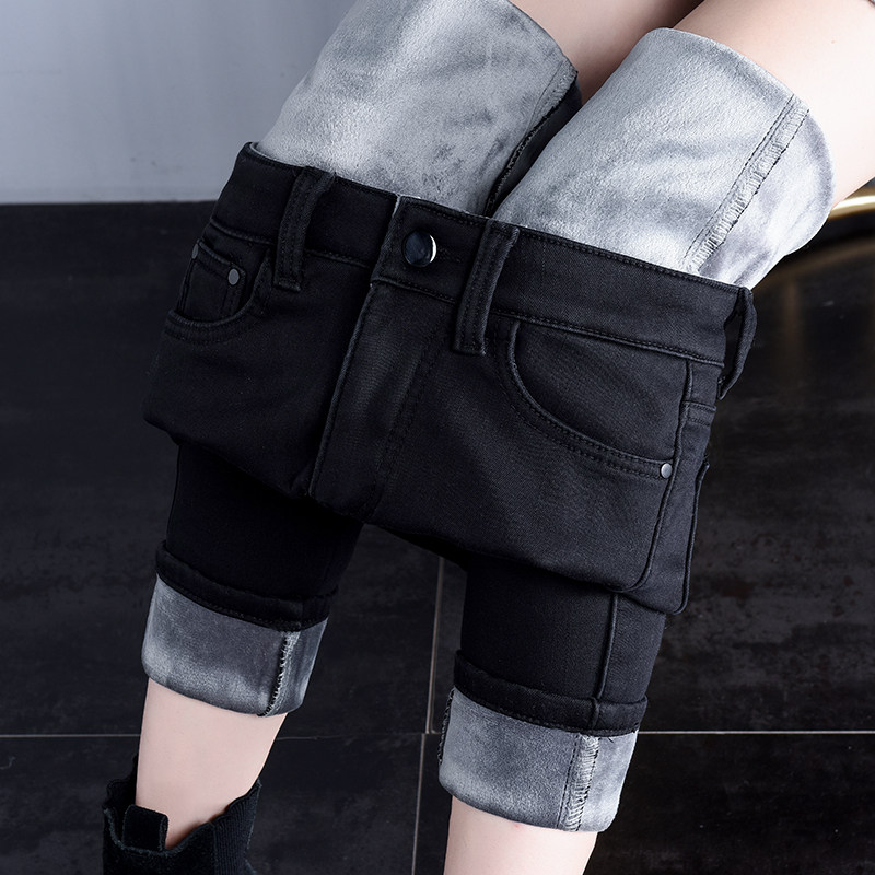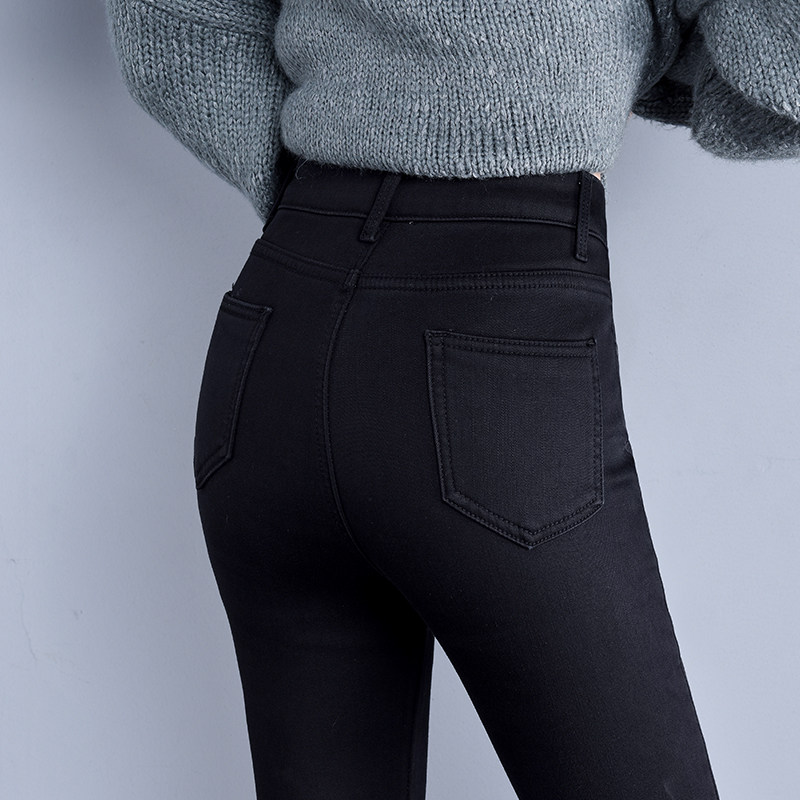 Hafted jeans high waist winter black thickening and thin and thin, high outwear elastic small pants nine pants