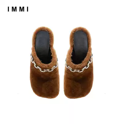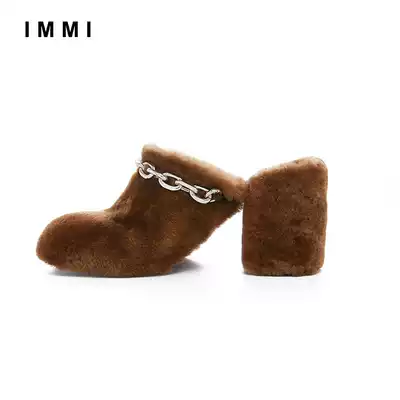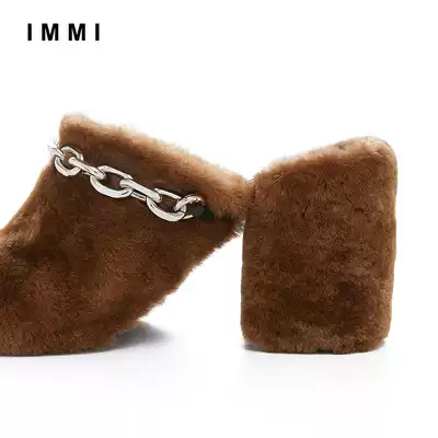 (Designer brand IMMI)Caramel color square head hairy thick heel Muller slippers 192SH007L