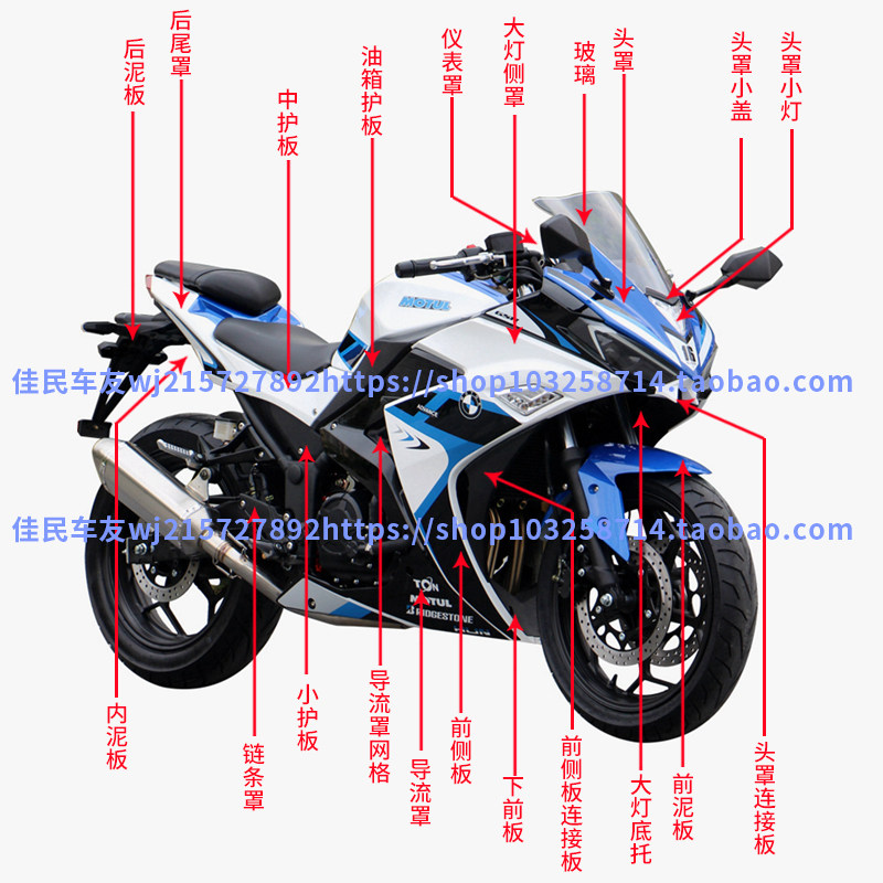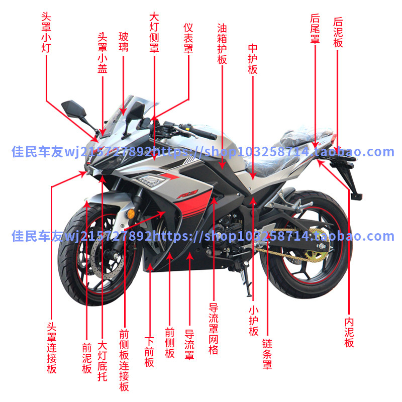 Black Gray Silver beige Front fender hood Hood connecting plate Front side cover A pair of large guards A pair of lower deflectors A pair of middle guards A pair of rear tail shell A pair of rear tail connecting plate Windshield instrument memory passenger
