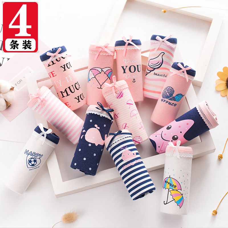 4 Packs Women's Pure Cotton Underwear Breathable Middle Waist Low Waist Girls Large Size Korean Version Student Cotton Crotch Briefs Head