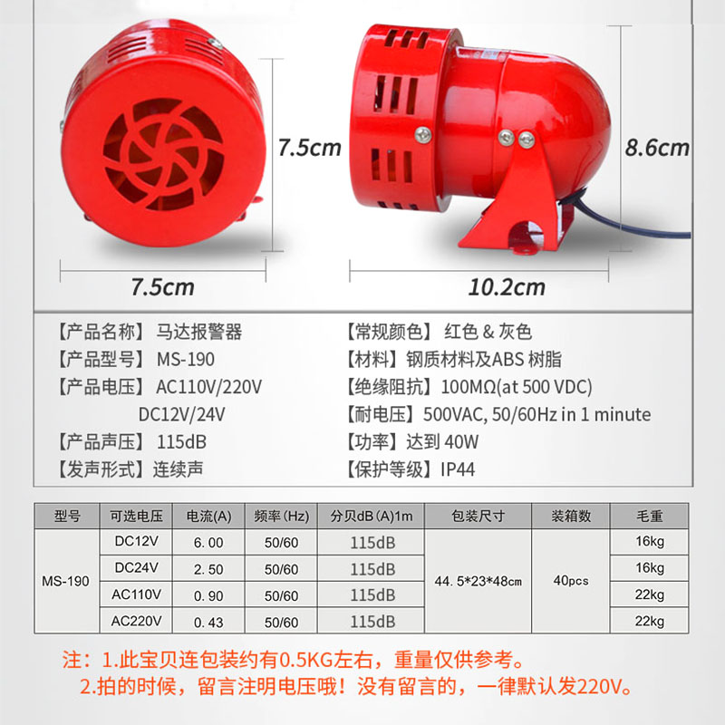 MS190 290 390 Mini motor alarm Wind screw motor alarm horn 220V24V12V