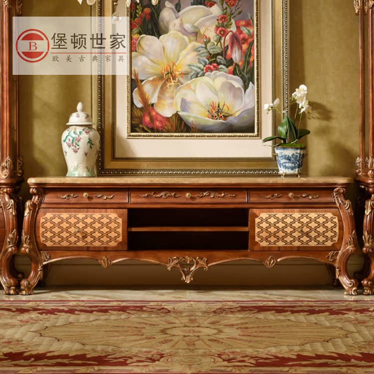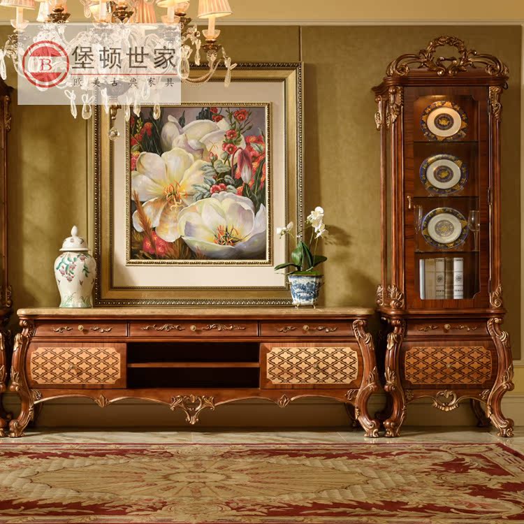 French luxury TV cabinet European villa floor cabinet solid wood carving living room Italian high-end TV wine cabinet combination