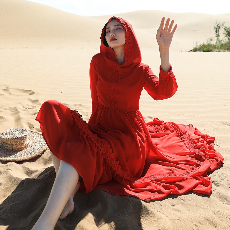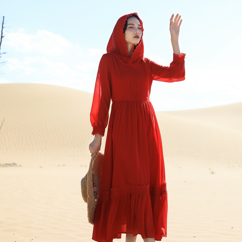 Qinghai Desert Brigade Pat on the Yangdress Small sub-long dress Red Lianhood Long sleeves Large pendulum snow-spinning Tibet Tourism clothes