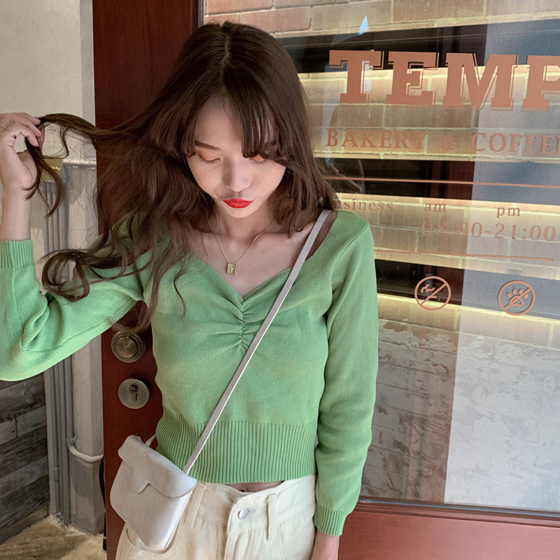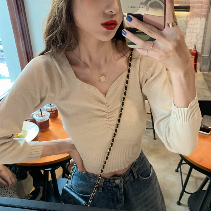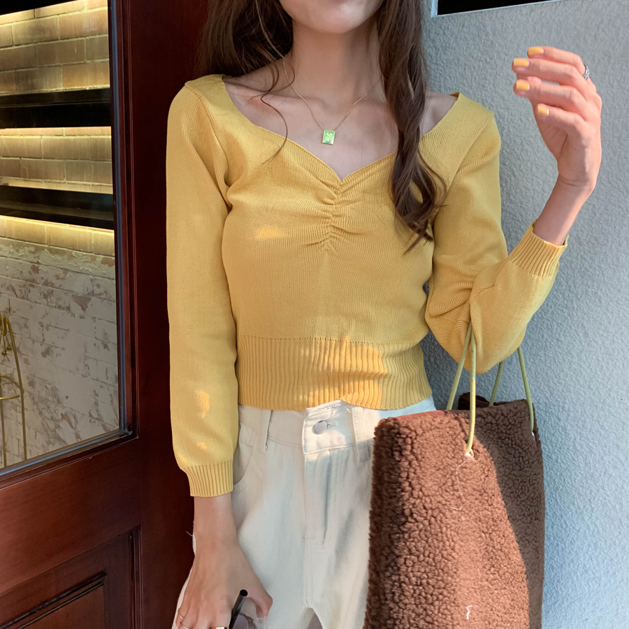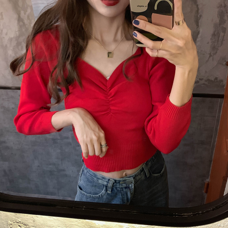2022 Spring and Autumn New Korean Retro Square Neck Short Jacket Women Slim Long Sleeve Joker Knitted Backing Shirt