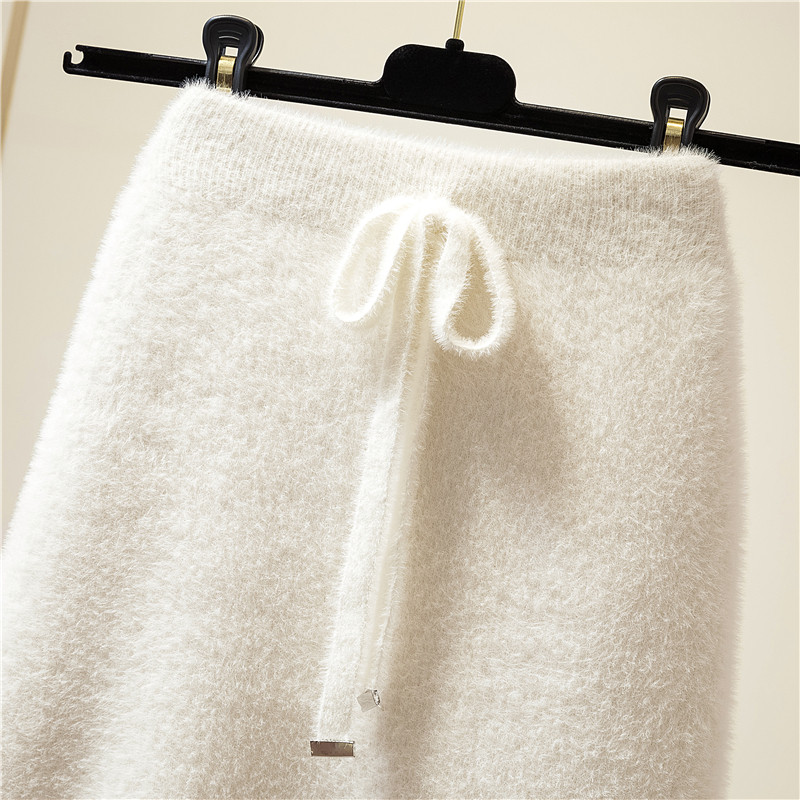 Thickened imitation mink velvet medium and long version lace-up skirt Autumn and winter knitted split wool skirt Hip winter skirt