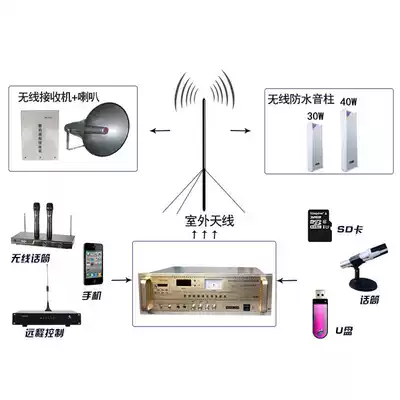 Wireless transmitter (including antenna) Wireless Receiver (50W) Wireless Receiver (100W) wireless sound column (30W) wireless sound column (40W) remote controller (optional)