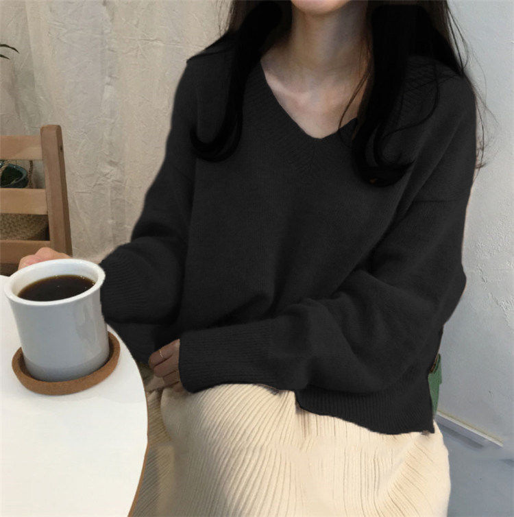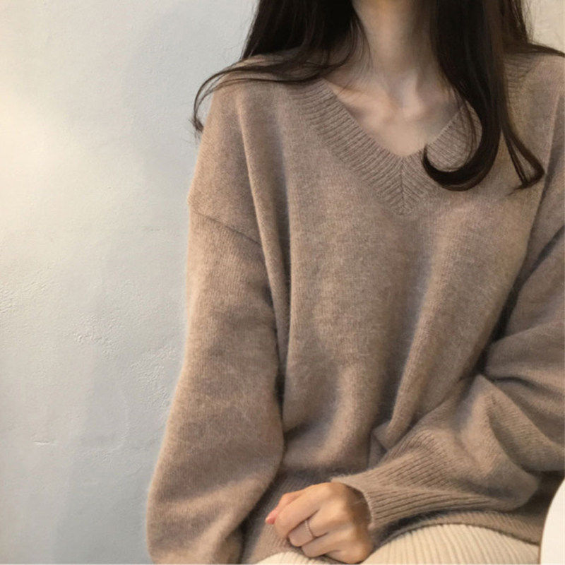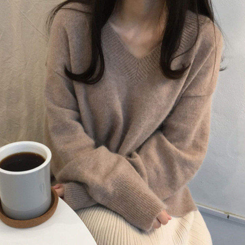 Knitted undershirt blouses woman 2022 spring autumn new Korean version loose and lazy inins wind set head large V collar fur coat wave