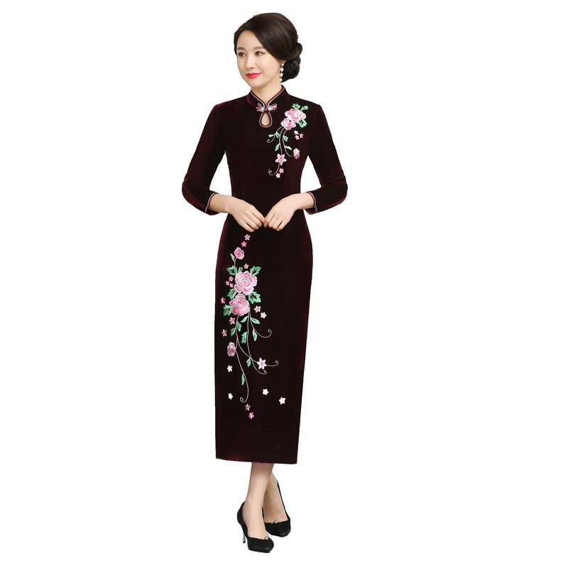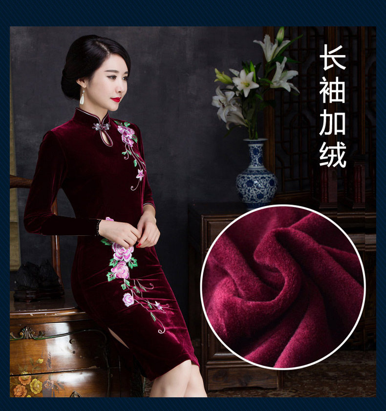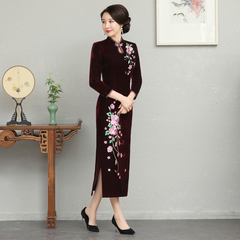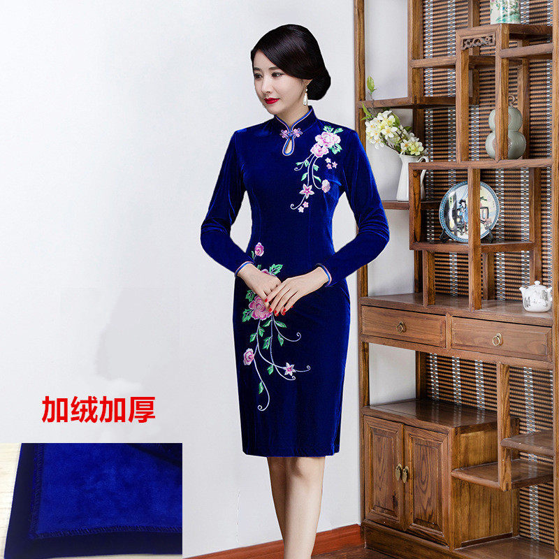 2021 winter qipao thicken plus suede gold velvet embroidered embroidered middle aged mother gown with long sleeve long version warm woman