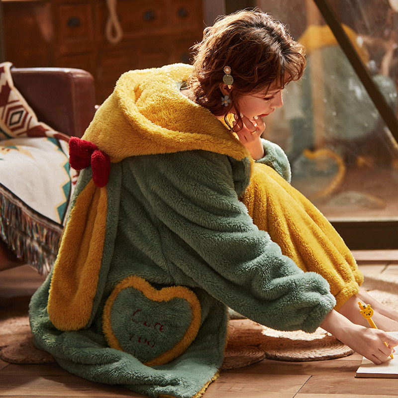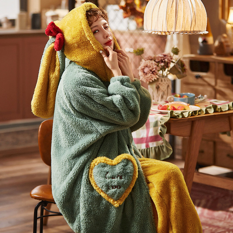 Pyjamas women's autumn winter thickened warm can outside wearing coral suede sleeping robe with long version of bathrobe suit flannel suede