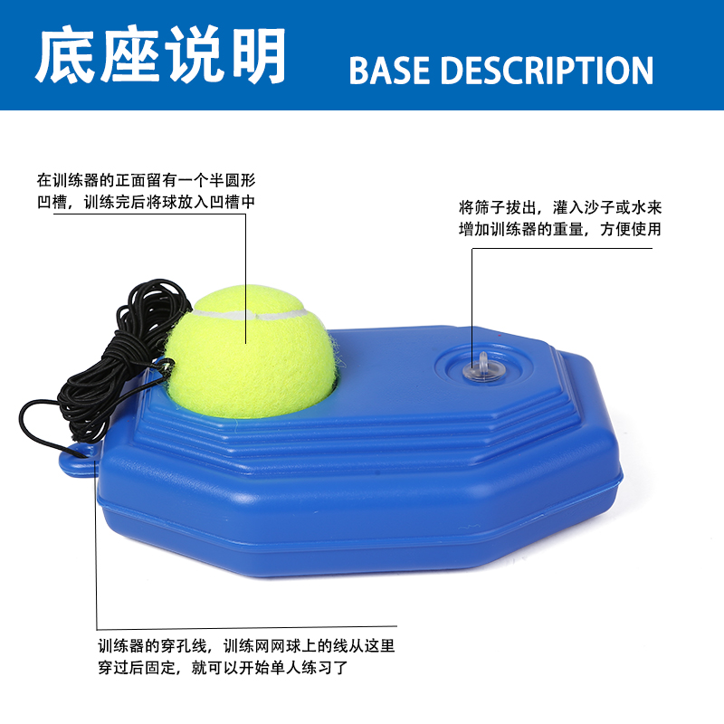 1 blue tennis racket 1 tennis trainer 1 black elastic rope tennis ball 1