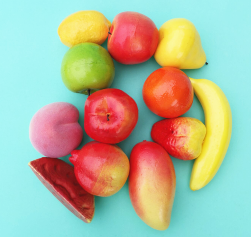 Green yellow red watermelon red orange red rose red lemon yellow almond pineapple large one small pineapple one small pineapple one small bread one doughnut bread one without bag of sesame bread