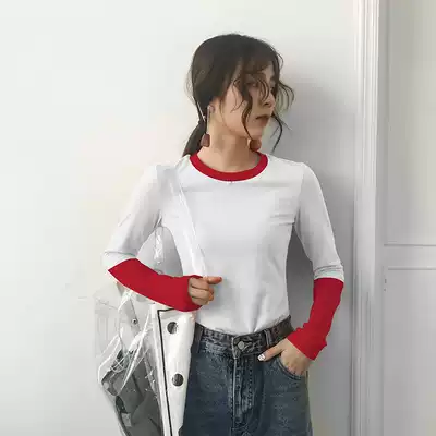 Base shirt women's long sleeve color T-shirt cotton stitching wine red slim fit Joker Korean version of tight body top tide