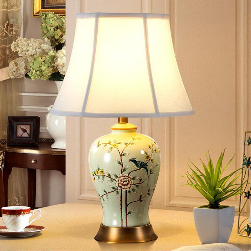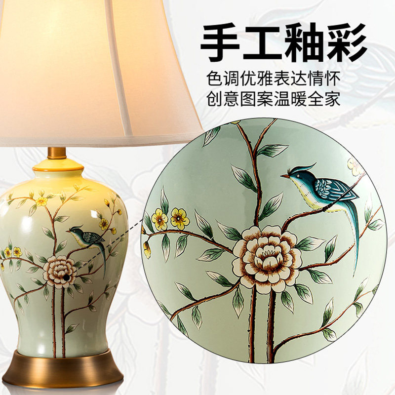 Ceramic table lamp Bedroom bed Headlights Chinese vintage American Country Living room Handpainted flower Birds bronze Seating Cloth Art Lamps