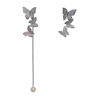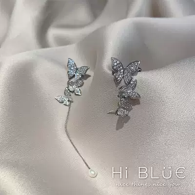 Korean asymmetric micro-inlaid butterfly earrings long version of temperament earrings exquisite silver needles ear needles Super fairy Autumn and Winter earrings