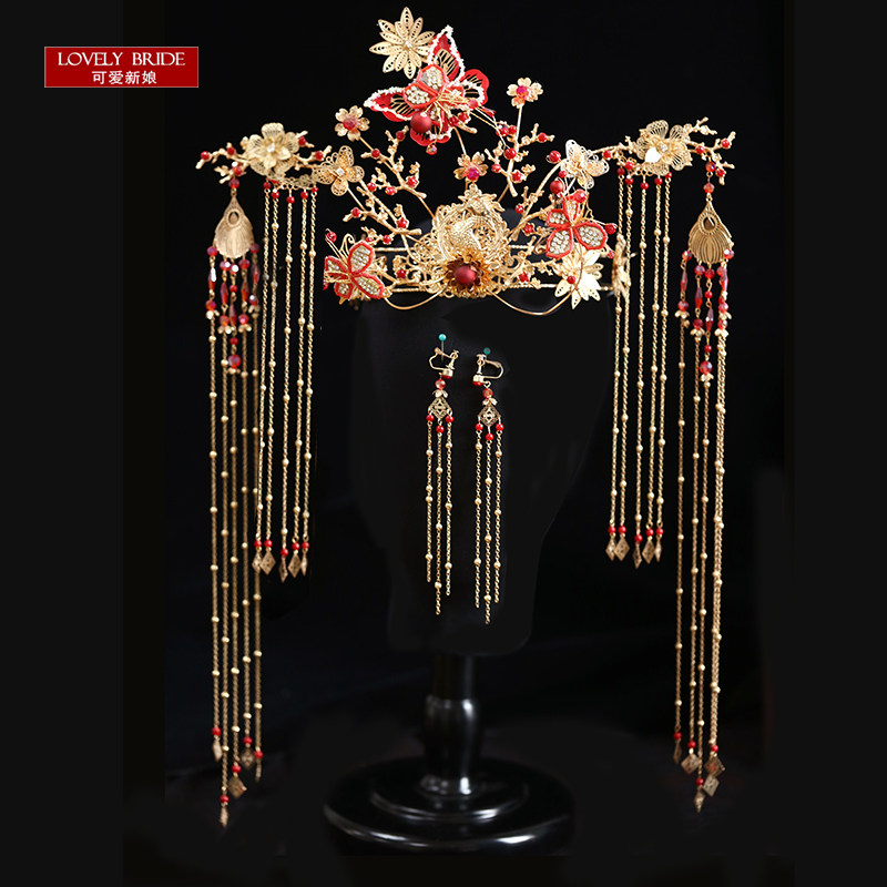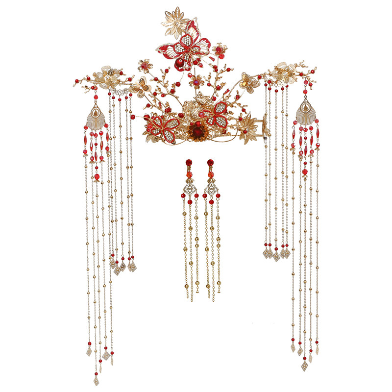 2021 new Chinese wedding red butterfly Fengguan Classical gold long stream Su head decorated with bridal ornaments