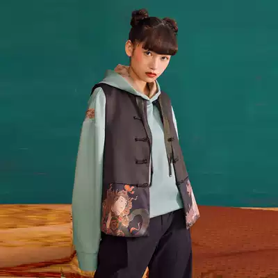 (Mustard original)Off-the-cuff Chinese style stand-up collar handmade plate buckle printing design improved Tang suit thin cotton vest