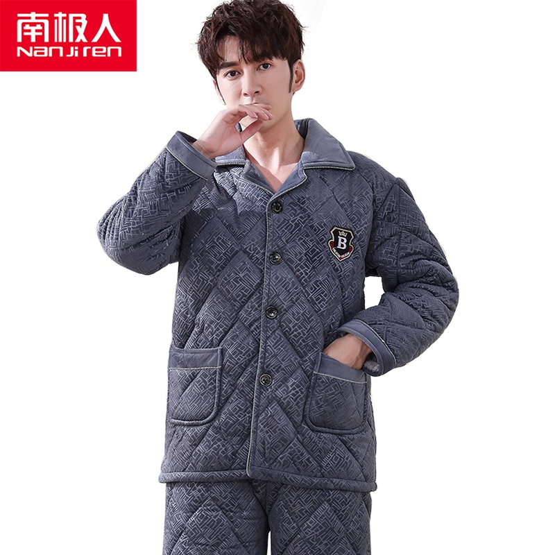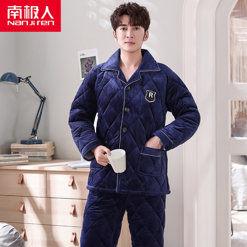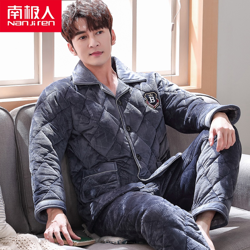Men's Pajamas Winter Coral Suede Thickened Triple Clip Cotton Gushed Flannel Flannel Sumpsuit Warm And External Wear Suit