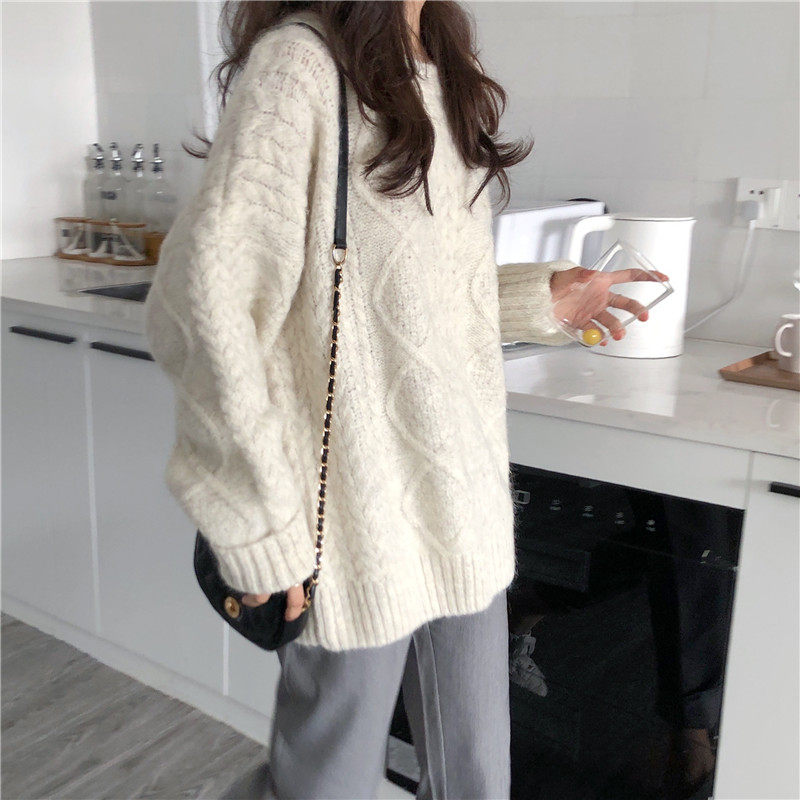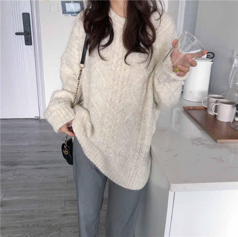 Mohair twist sweater women's autumn and winter outerwear loose lazy style round neck pullover mid-length knitted top thickened