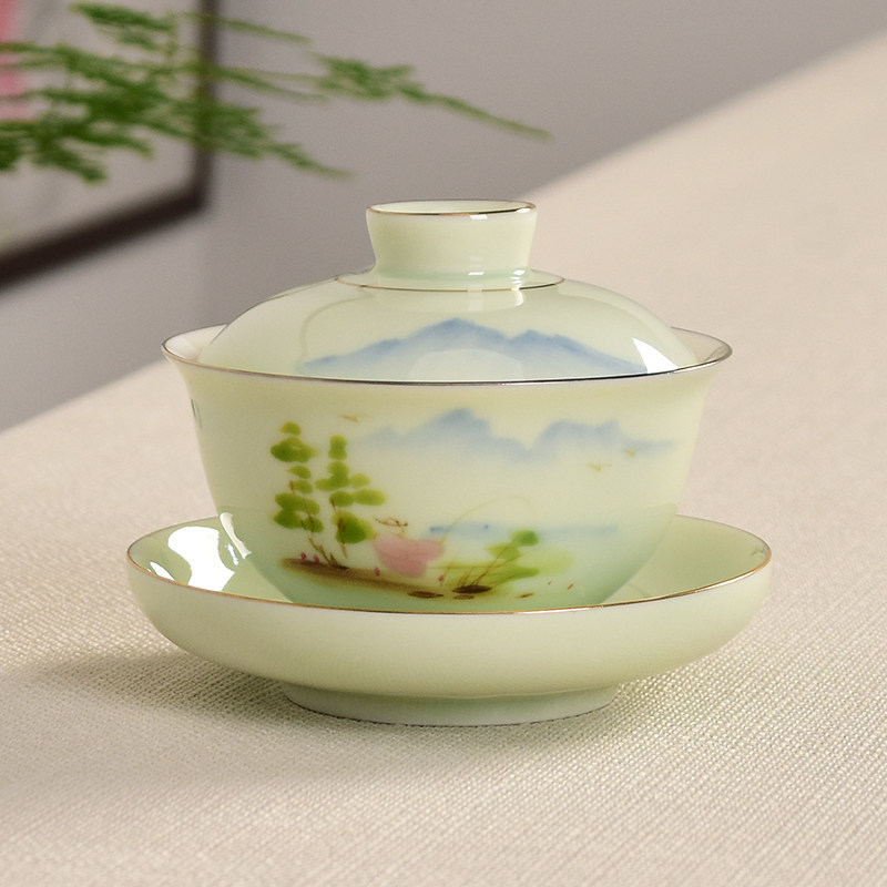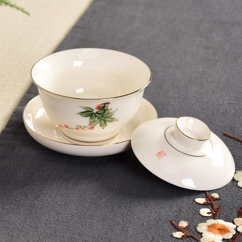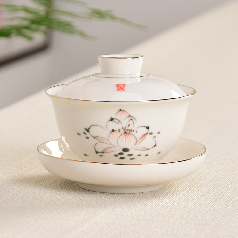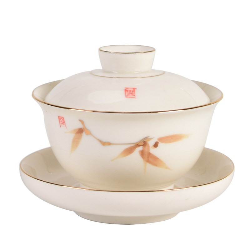 Craft single hand-drawn three to cover a bowl of ceramic tea bowl white porcelain kung fu tea set household tea cup