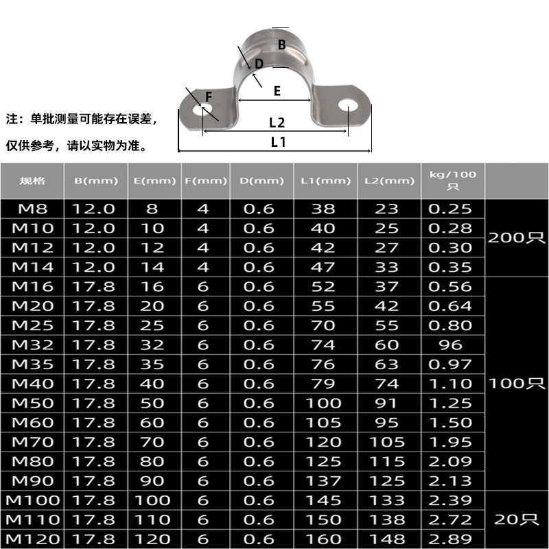 φ8 (200 bags) (applicable pipe outer diameter 8mm) φ10 (200 bags) (applicable pipe outer diameter 10mm) φ12 (200 bags) (applicable pipe outer diameter 12mm) φ14 (200 bags) (applicable pipe outer diameter 14mm) φ16 (100 bags) (applicable pipe outer diameter 16mm) φ20 (100 bags) (applicable pipe outer diameter 20mm) φ25 (100 bags) (applicable pipe outer diameter 25mm) φ32 (100 bags) (applicable pipe outer diameter 32mm) φ35 (100 bags) (for pipe OD 35mm) φ40 (for pipe od. 40mm) (for pipe 40mm) φ50 (for 100 bags) (for pipe 50mm) φ60 (for 100 bags) (for pipe 60mm) φ70 (for 100 bags) (for pipe outside diameter 70mm) φ75 (100 bags) (for pipe outside diameter 75mm) φ80 (100 bags) (for pipe outside diameter 80mm) φ90 (for 100 bags)( Applicable pipe outer diameter 90mm) φ100 (20 bags) (applicable pipe outer diameter 100mm) φ110 (20 bags) (applicable pipe outer diameter 110mm) φ120 (20 bags) (applicable pipe outer diameter 120mm) plastic expansion M6*30 (20 sets price) (riding card large flat head mounting screw)