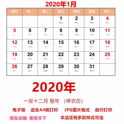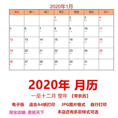 2020 calendar Simple A4 calendar diy calendar plan This large grid plan JPG format electronic version