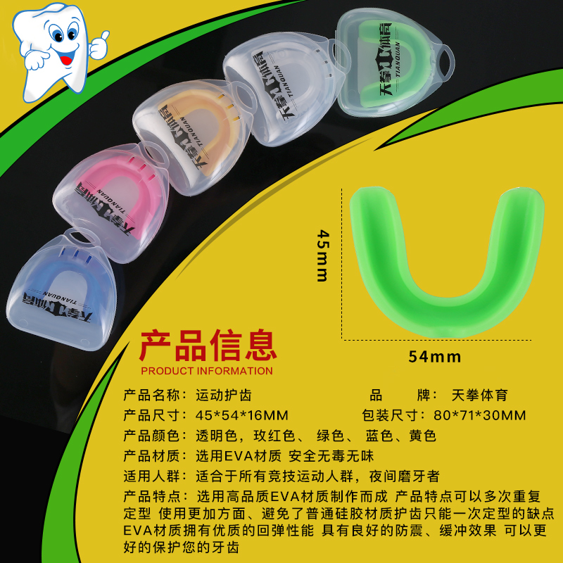 Green single-sided mouthguard Blue single-sided mouthguard Pink single-sided mouthguard Double-sided mouthguard Transparent single-sided mouthguard Yellow single-sided mouthguard