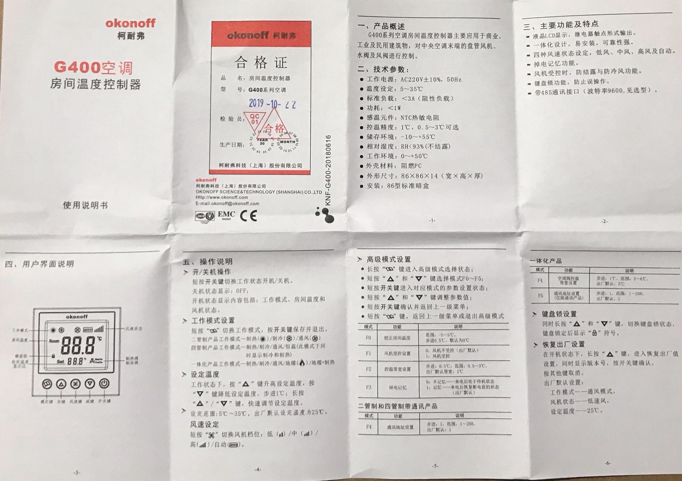 Könefer thermostat central air conditioning control panel ventilator coil temperature-controlled switch okonoff G400