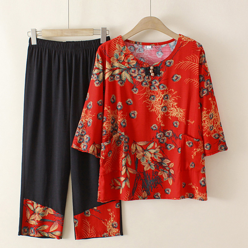 Large size women's mother's summer suit cotton and linen women's plus fertilizer plus grandma print top two-piece old man's clothes