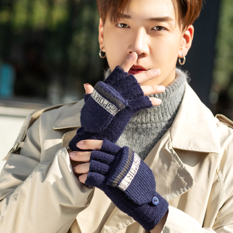 Men's gloves winter warm riding cold half finger plus velvet flip open finger women's knitted wool autumn and winter students