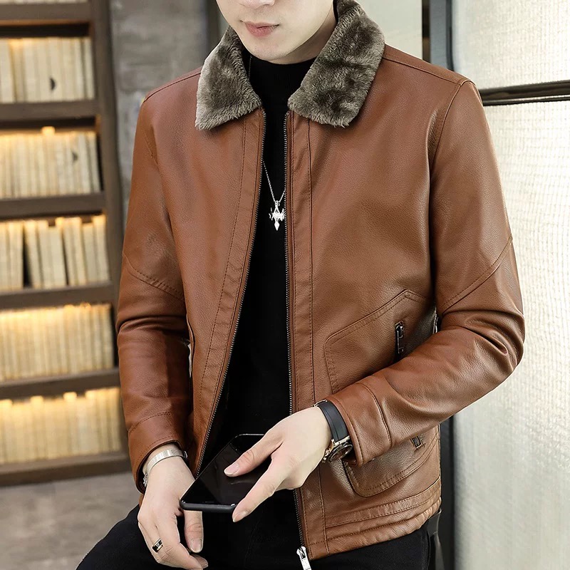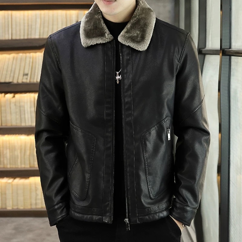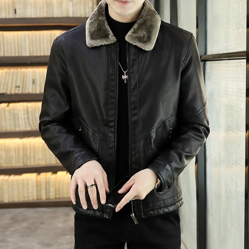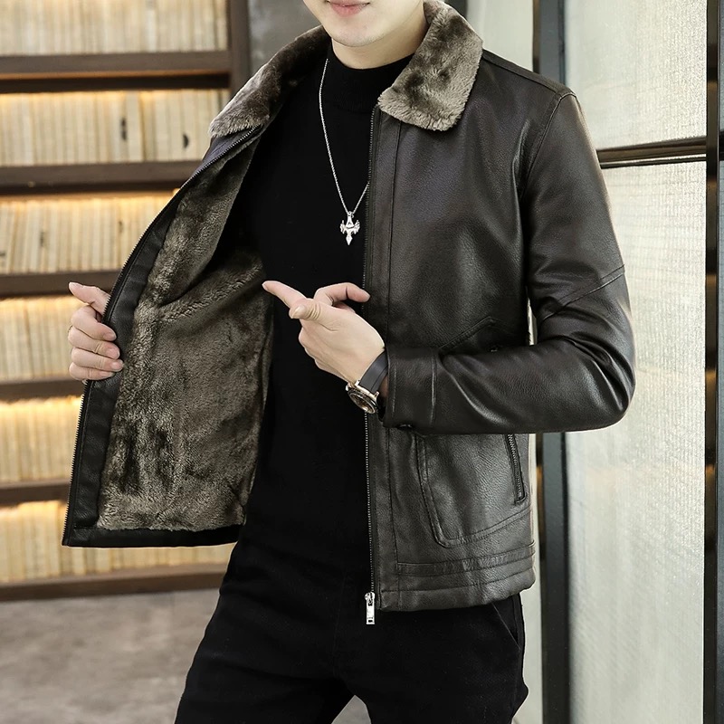 Men's leather jacket plus velvet thickened winter lamb wool trendy lapel handsome genuine leather short fur coat for men