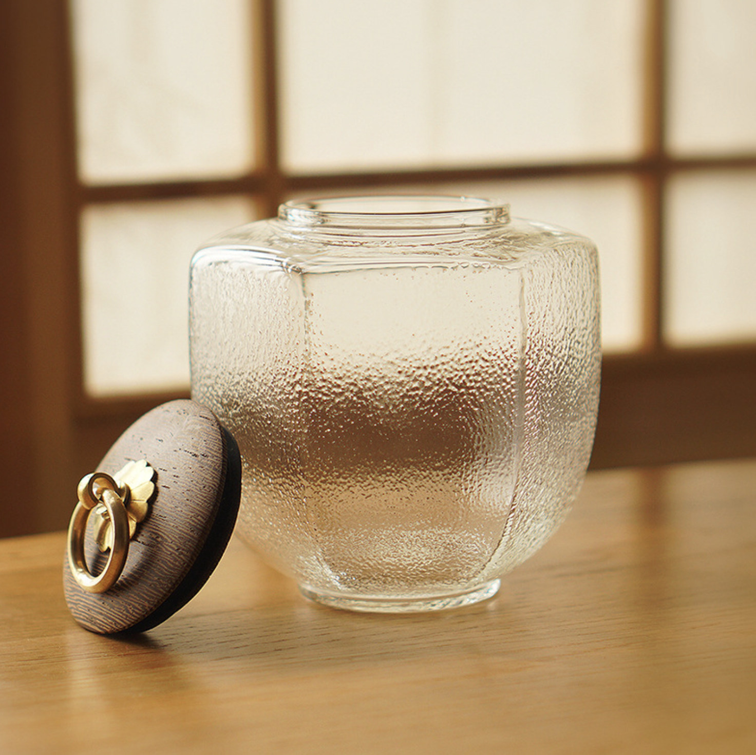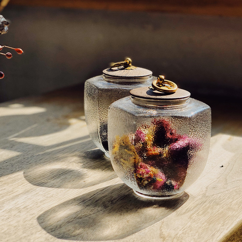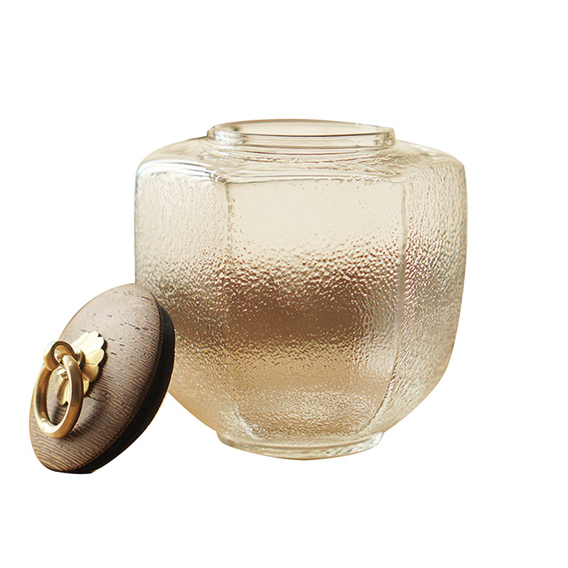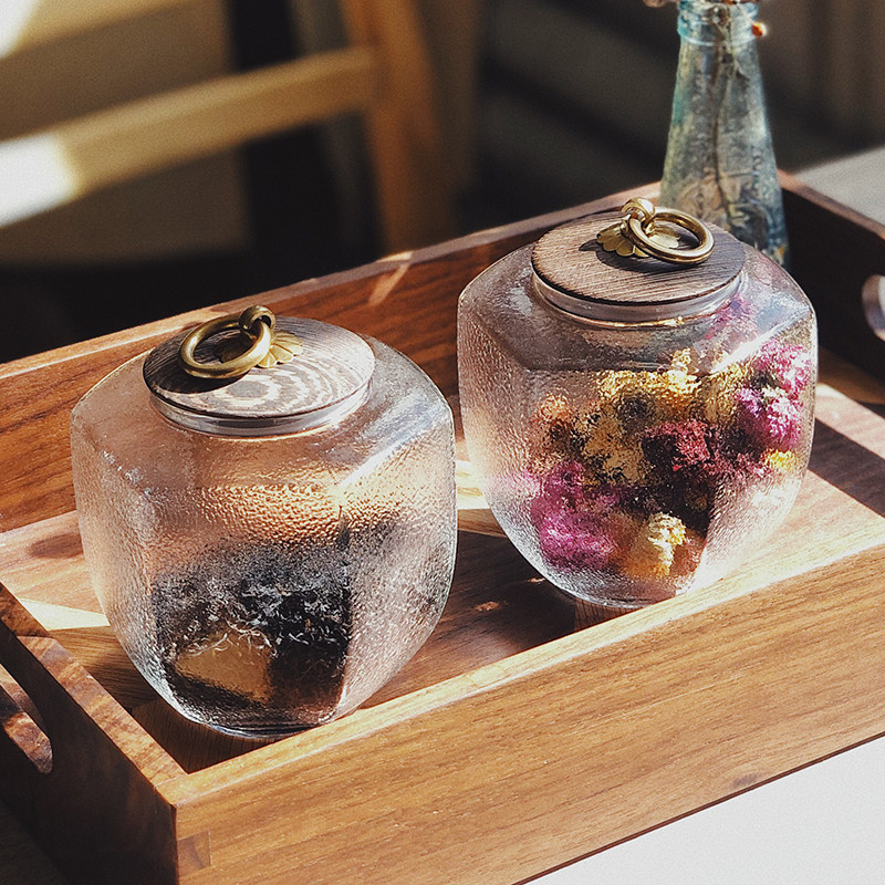 Life original Japanese retro wooden cover glass storage tank Tea can storage sealed tank Hammer mesh pattern copper ring handle
