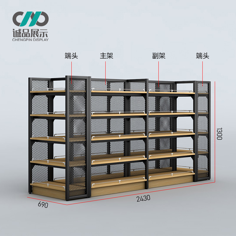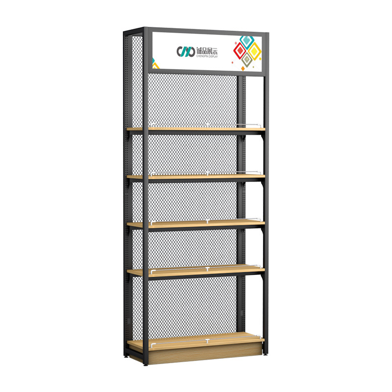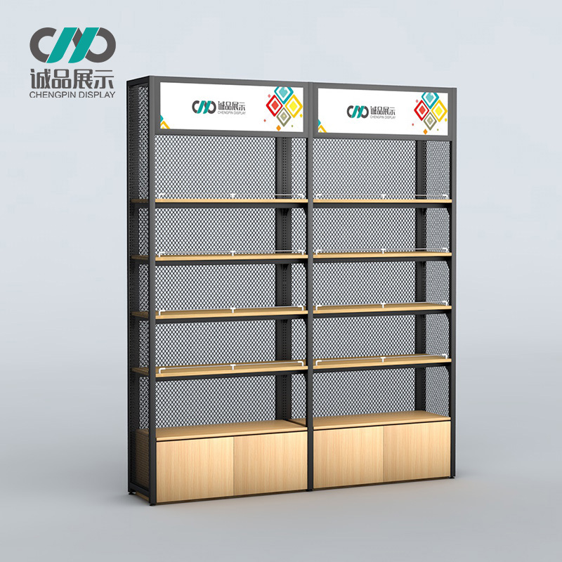 Supermarket convenience store shelves Snack food commissary steel and wood display rack Diamond grid multi-function display rack