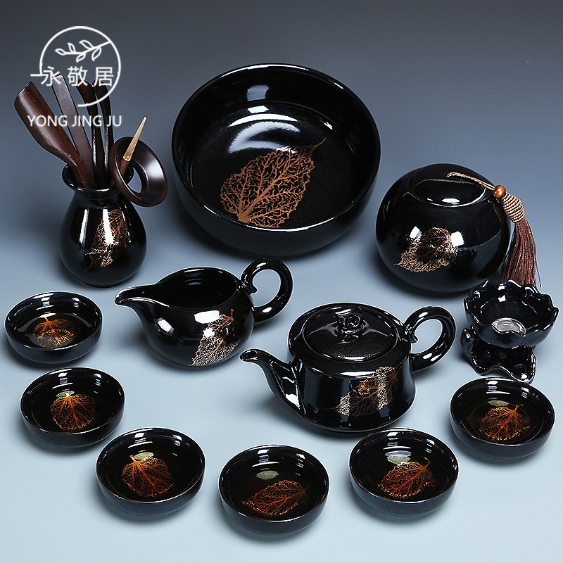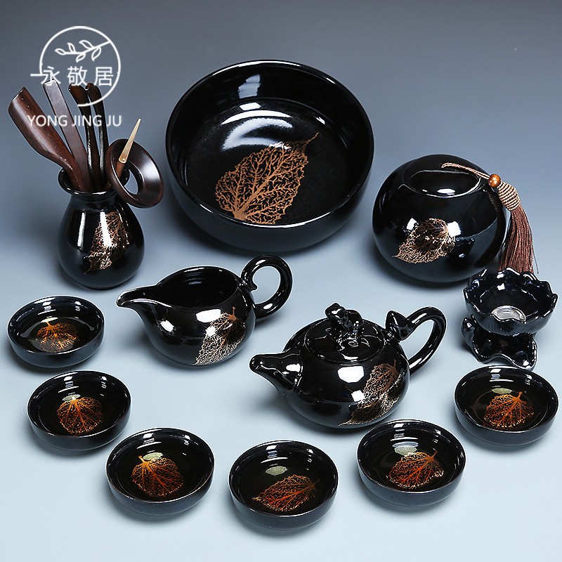 Yongjing dwelling kiln turns glazed and made black ceramic gold leaf for a whole set of household kung fu tea set