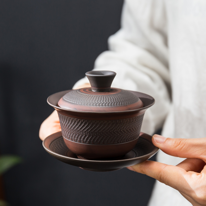 Sancai cover bowl tea cup purple pottery tea set hand grasp tea maker large tea bowl household ceramic hand jump knife