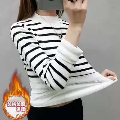 Warm sweater female student padded velvet 2021 autumn winter New knitted striped long sleeve semi-high collar base shirt