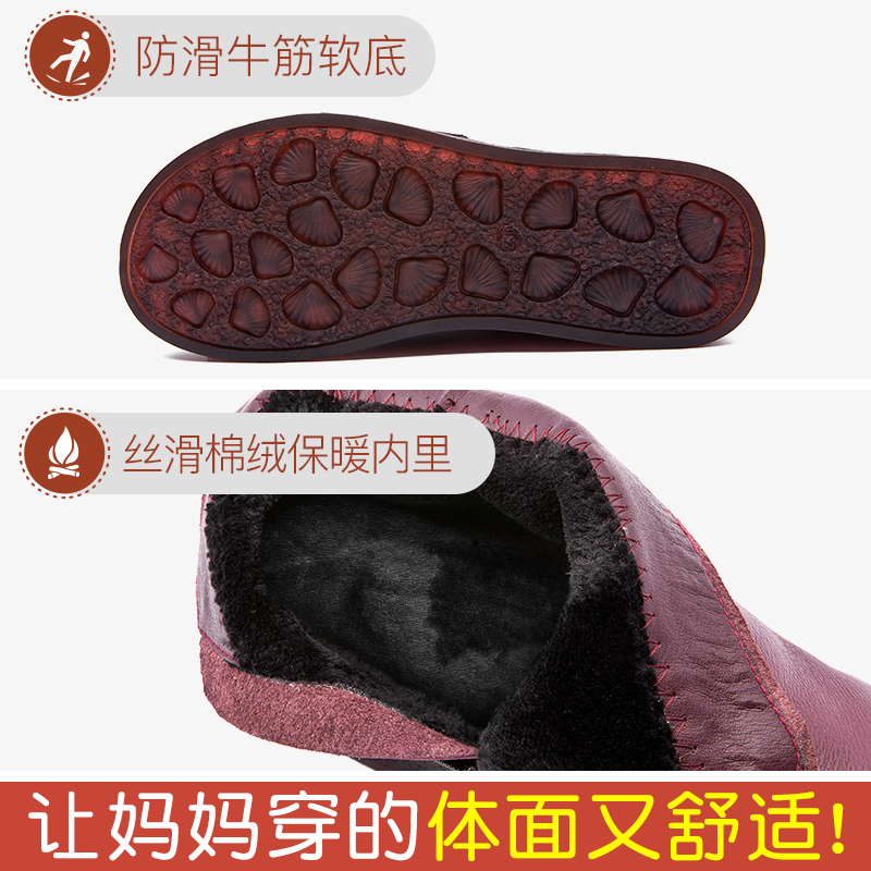 Tendon bottom winter mother cotton shoes leather plus velvet snow boots middle-aged and elderly comfortable soft bottom non-slip flat short boots women