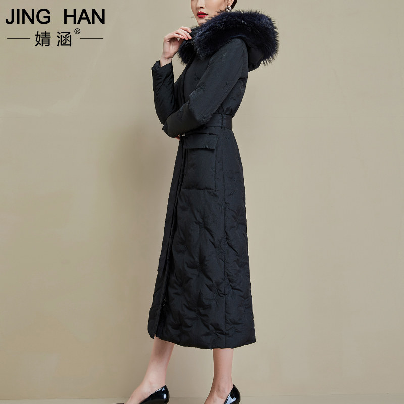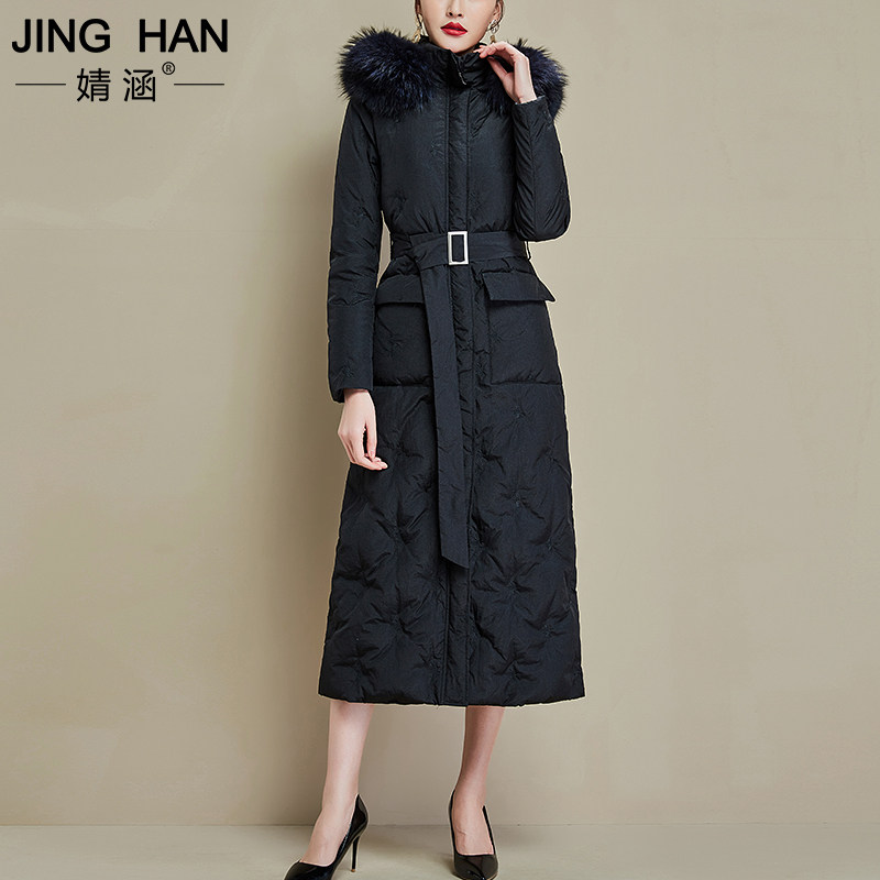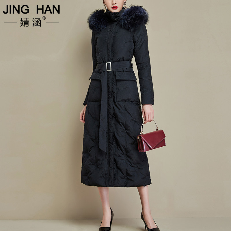 Jinghan 2020 winter new long knee to ankle thickened white duck down raccoon fur collar black down jacket female
