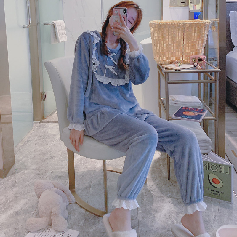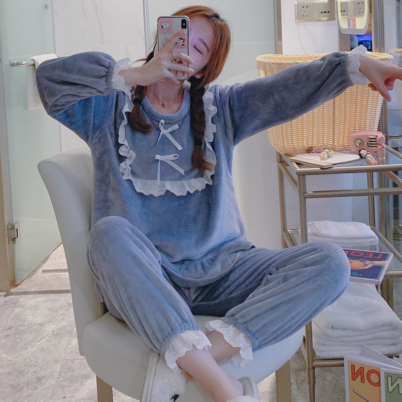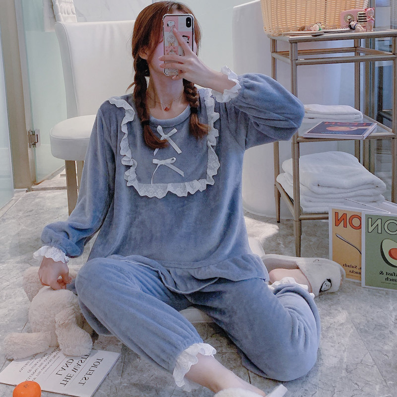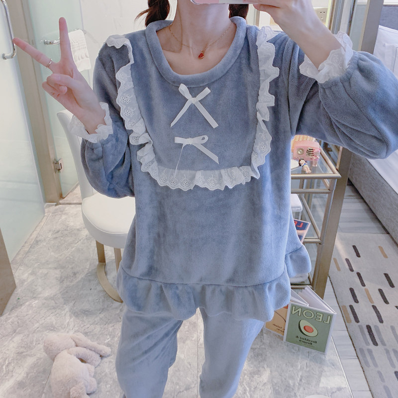 Little fairy pajamas women's autumn and winter flannel lace fresh mist blue princess coral velvet home dress set