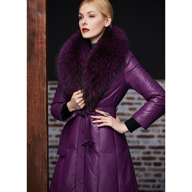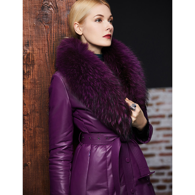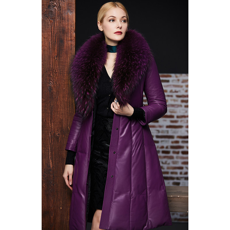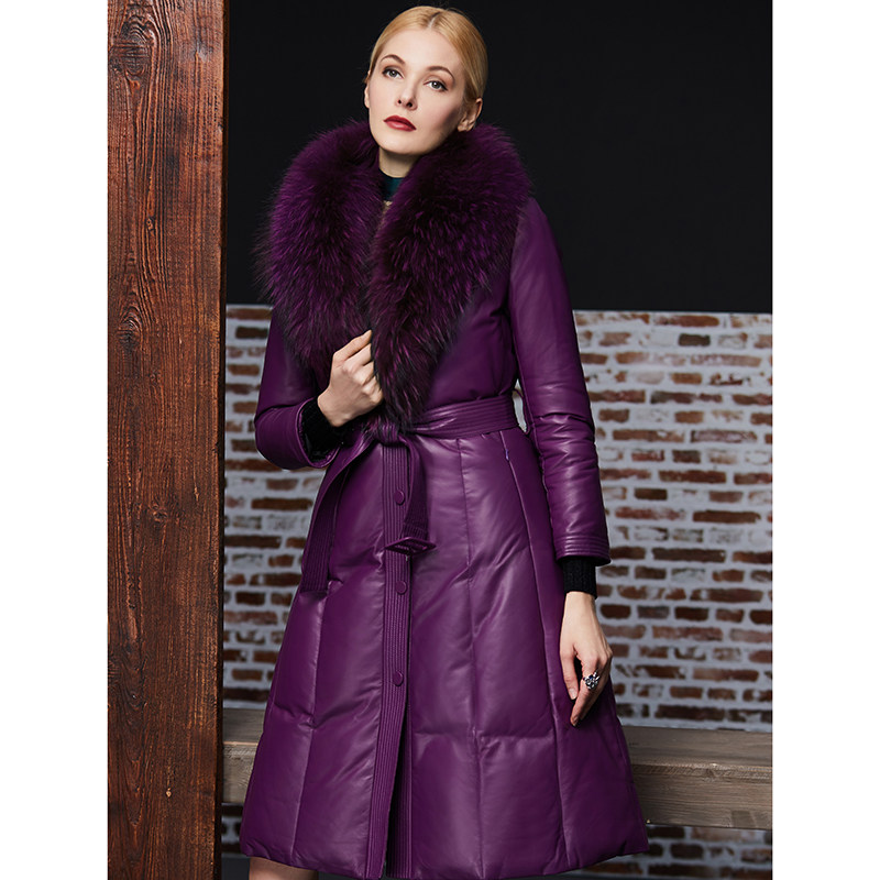 U N Q luxurious whole leather big raccoon fur collar in the middle long version of sheep skin thickened warm genuine leather down clothes woman
