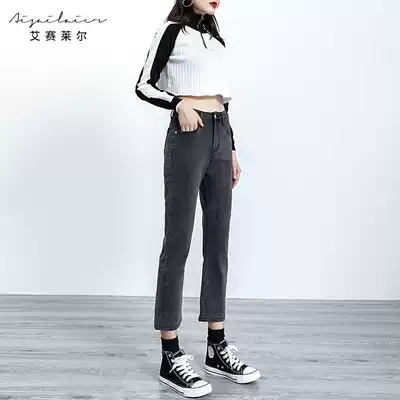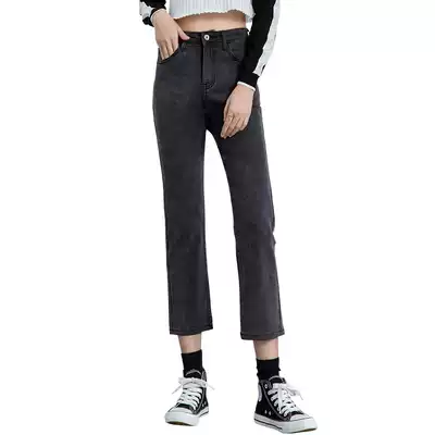 Black plus velvet straight jeans Women's Small man 2021 autumn and winter New loose high waist wide legs eight nine pants