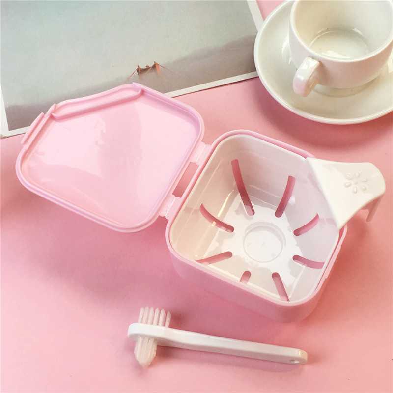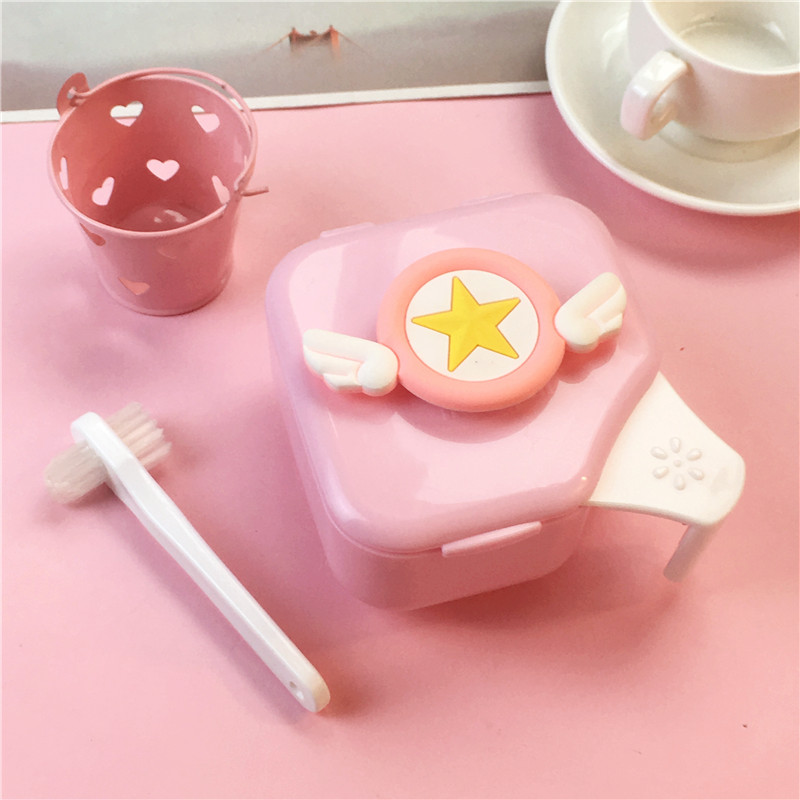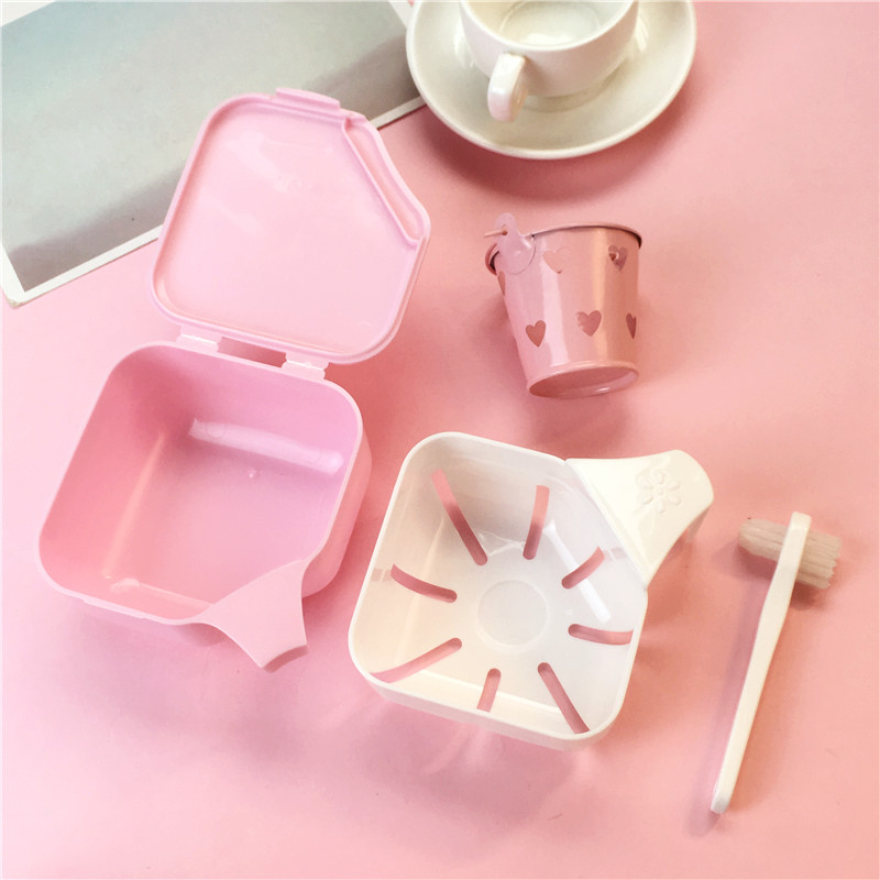 Japan imports double decker cartoon cute denture box Storage dental cover holder washing case Invisible Pink Lady