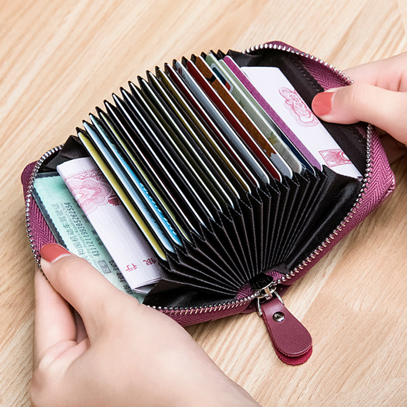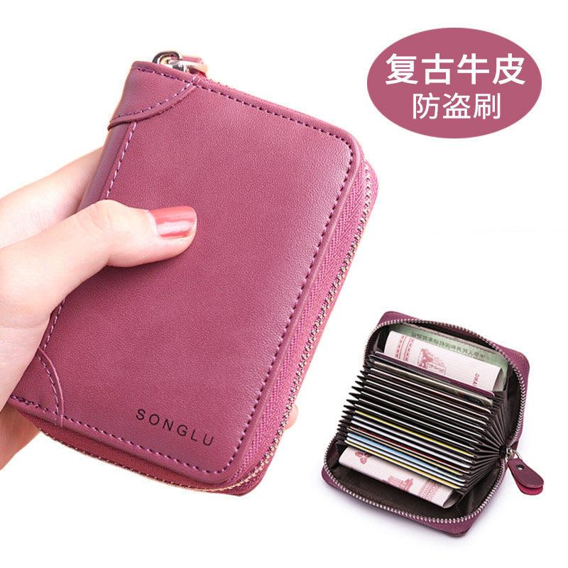 Real leather card bag female burglar-proof brush anti-magnetic cow leather multi-position wind violin style small chain with large capacity driver's license