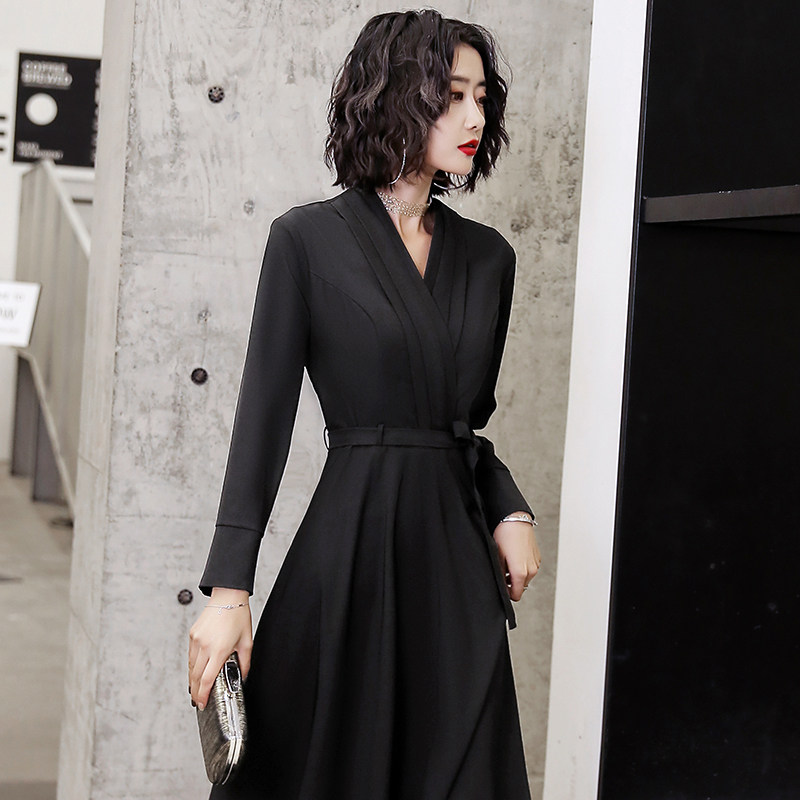 Evening dress skirt women 2020 new black long-sleeved long-sleeved high-end temperament banquet dress light luxury niche