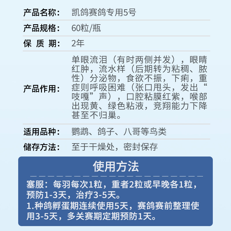 Kai pigeon pigeon medicine Daquan No. 5 60 capsules parrot pigeon bird single-eyed cold eyes red and swollen tears special medicine