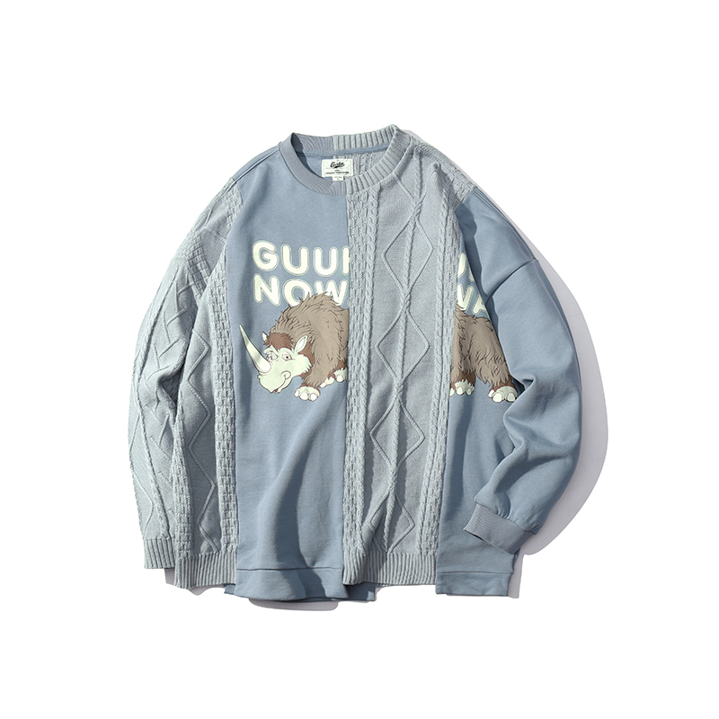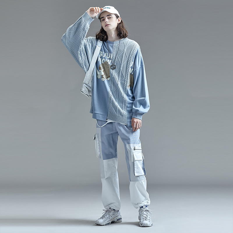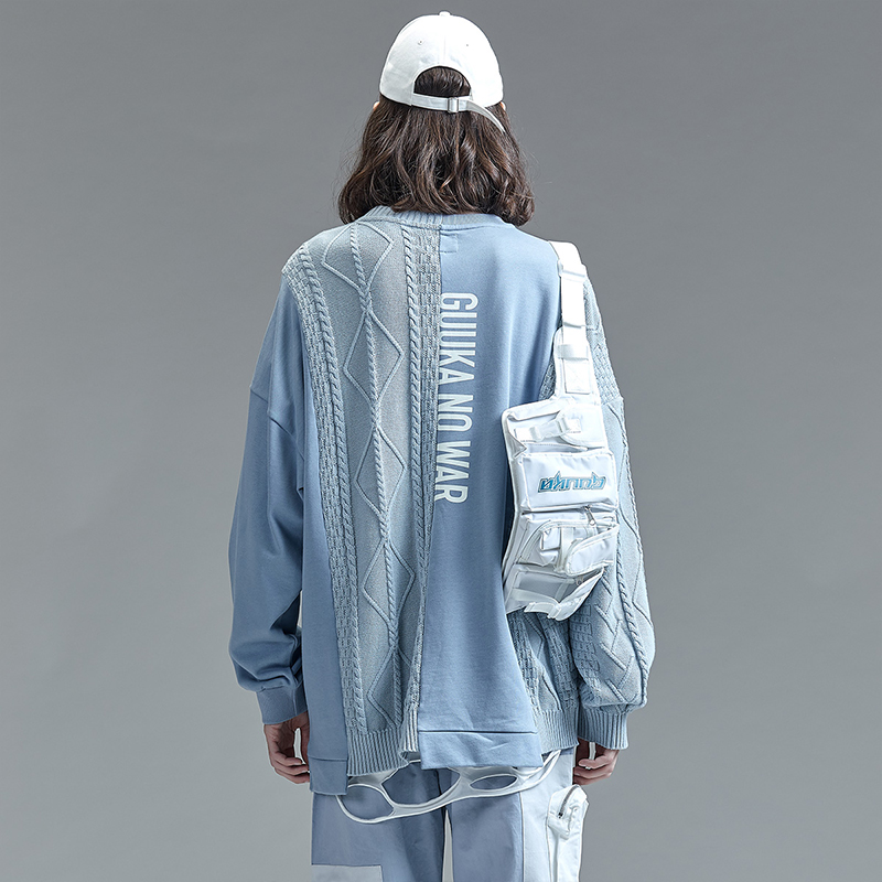 GUUKA Tide brand blue sweatshirt men's round neck youth Hip Hop print stitching knitted trousers thick cotton T men loose