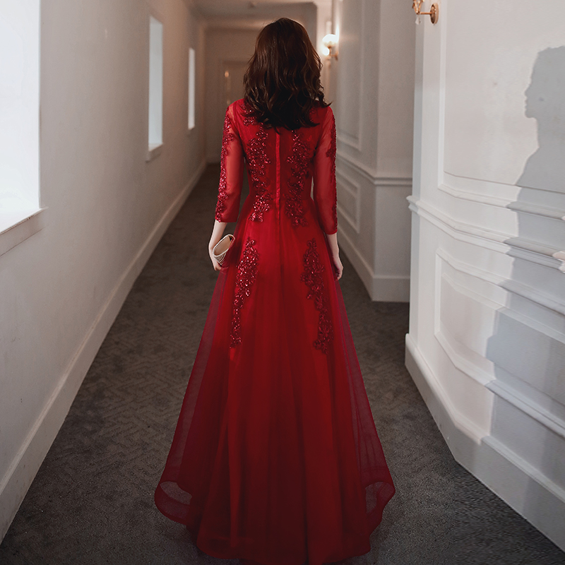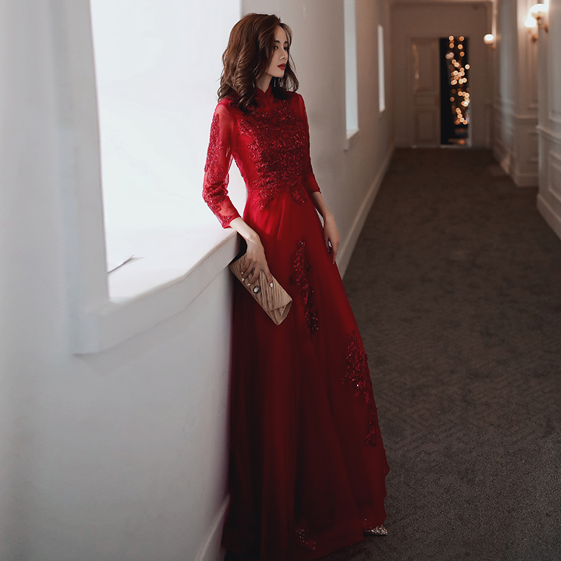 Toast to the bride 2022 new Chinese temperament Long version pregnant woman Long sleeves Thin Wine Red Wedding Evening Gown Woman