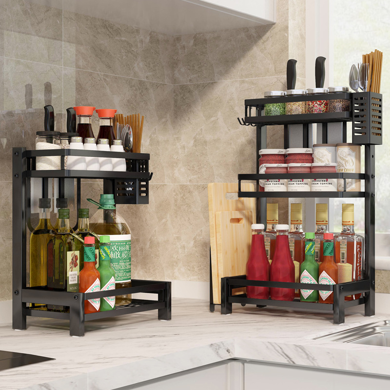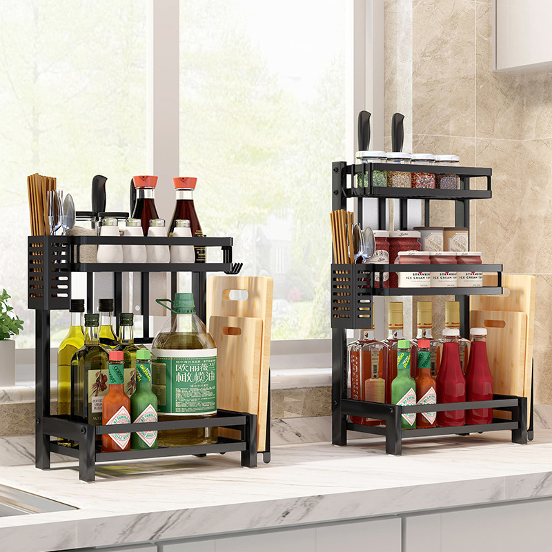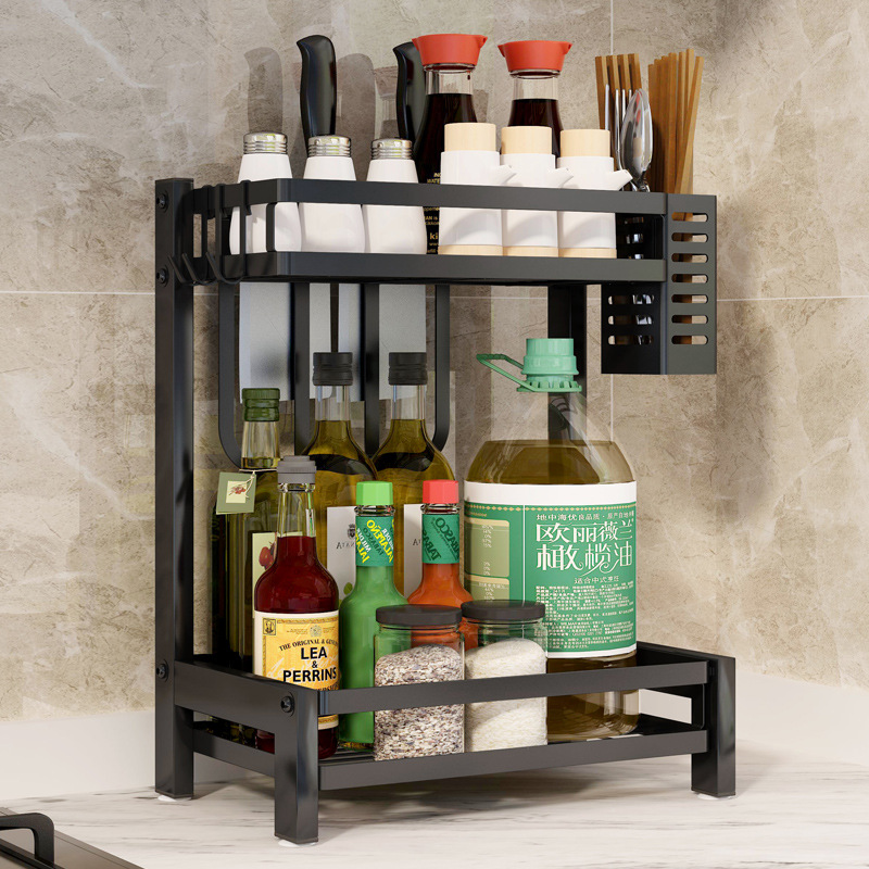 Kitchen rack countertop stainless steel knife holder household supplies black double-layer condiment storage shelf seasoning rack
