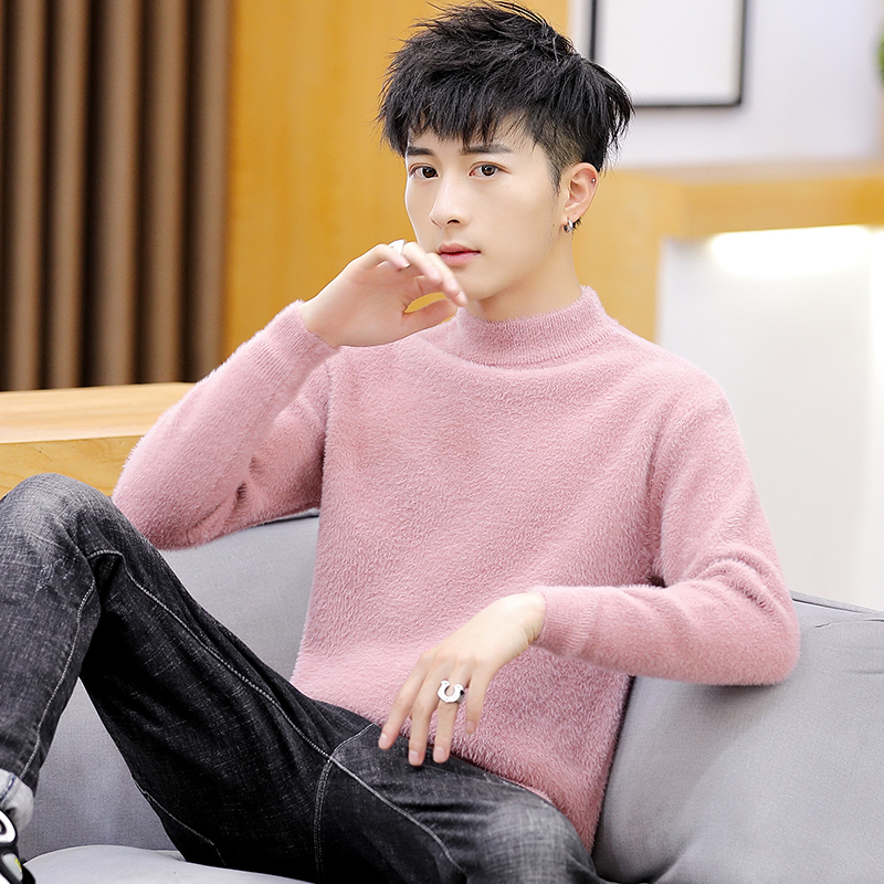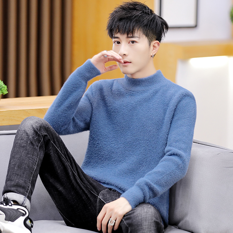 Mink velvet half turtleneck sweater men's slim bottoming shirt autumn and winter plus velvet thickened mid-neck warm sweater