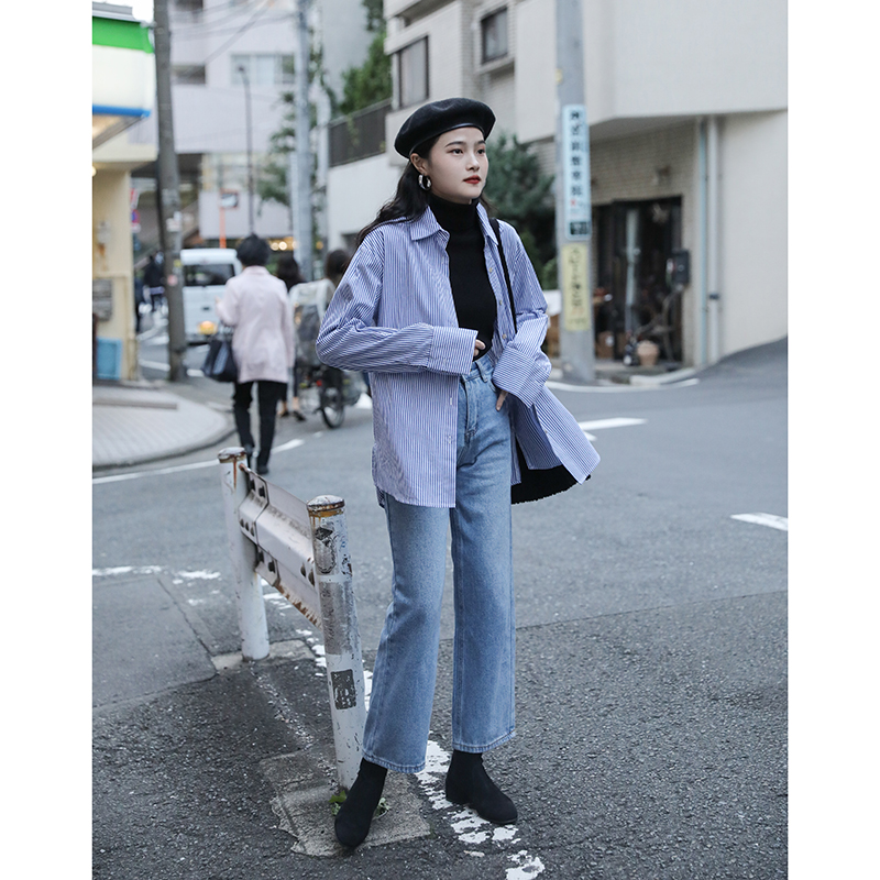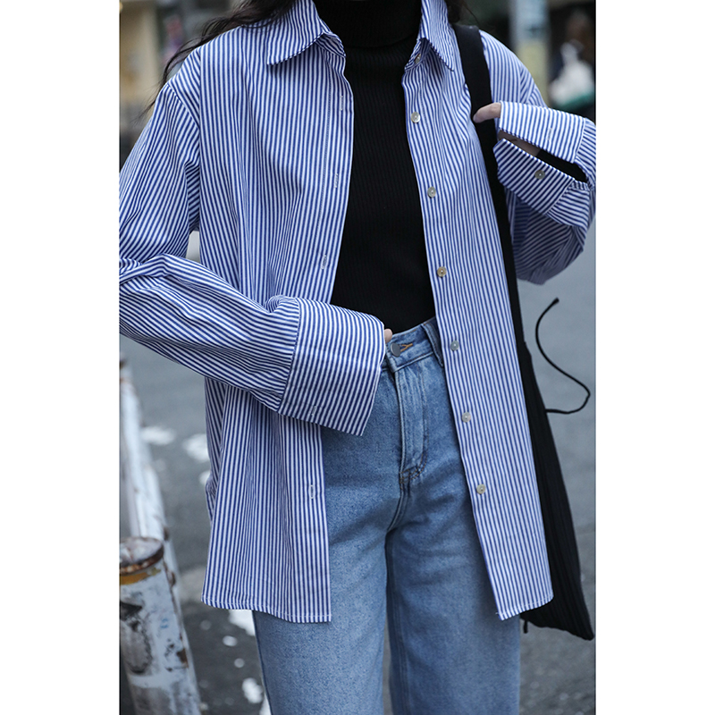 Mending blue vertical stripe long-sleeved shirt Women's Korean design sense niche top jacket 2021 early autumn shirt