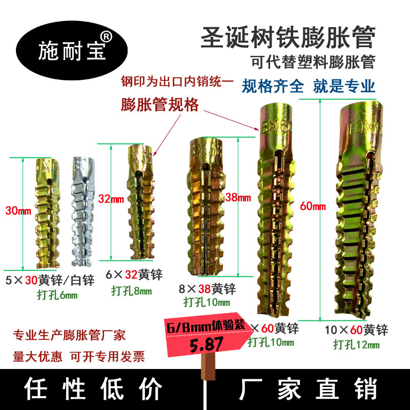 6mm (5*30) Yellow Zinc Expansion Tube 100 6mm (5*30) White Zinc Expansion Tube 100 8mm (6*32) Expansion Tube 100 10mm (8*38) Expansion Tube 20 10mm (8*60) Expansion Tube 20 12mm (10*60) Expansion Tube 20 6mm (5*30) Yellow Zinc Expansion Tube + Screw 100 Sets 6mm (5*30) White Zinc Expansion Tube + Screw 100 Sets 8mm (6*32) Expansion Tube + Screw 100 Sets 8mm ( 6 * 32) expansion tube extension 50 sets of 10mm (8 * 38) expansion tube + screw 20 sets of 10mm (8 * 60) expansion tube + screw 20 sets of 12mm (10 * 60) expansion tube 20 sets of 6mm and 8mm + screw each 10 sets of 6mm 50 sets + 8mm conventional 35 sets